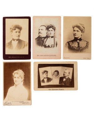 Four cabinet cards of the Clevelands: The Cleveland Family - Frances, "Baby Ruth" and Grover. Ca 1892. Lithograph of Mr. & Mrs. Cleveland; three photos. of Mrs. Cleveland. One with Hale's identification and copyright (Seneca Falls, NY, 1886) has a note on verso: "Mr. Hale I give my full permission and sanction to your selling any pictures you may desire. I will trust to your giving only the best ones Your pictures are by far the best I have ever had taken someday I hope you can try again for me. / Very truly, Frances Folsom Cleveland / June 14, 1886."