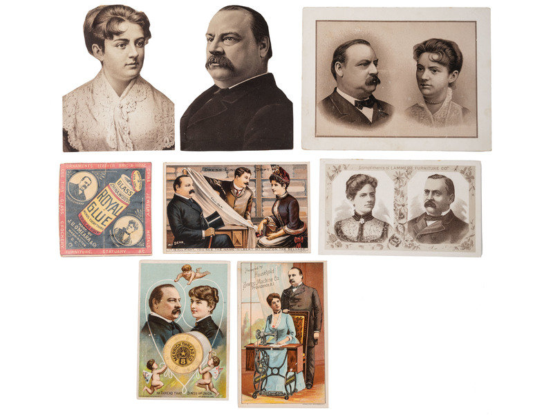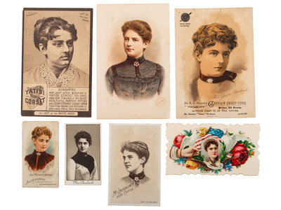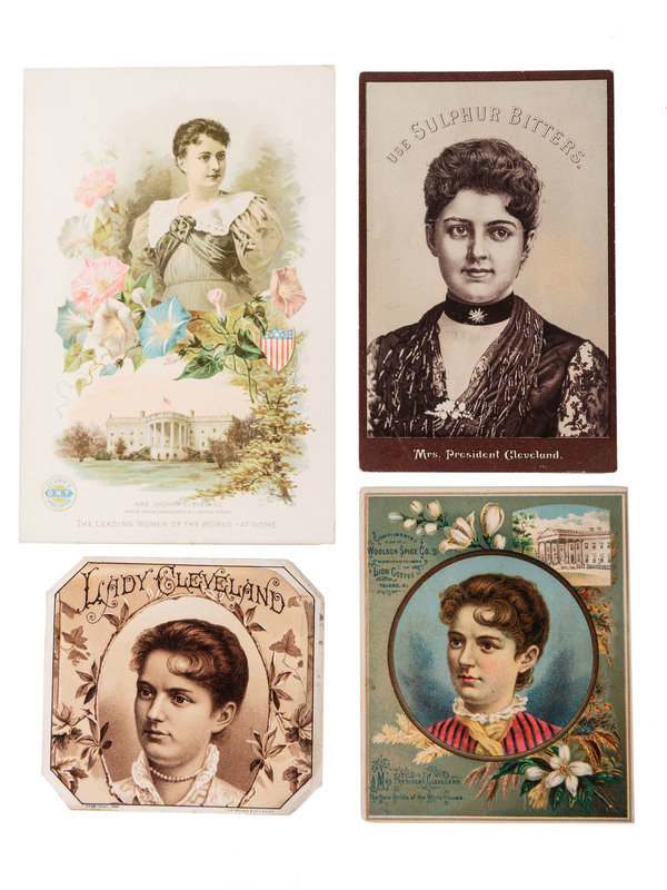 Mrs. Cleveland on a Cigarette card (color). Similar-sized card for tooth polish with Mrs. Cleveland in black and white. Business card for W.F. McLaughlin & Co., coffee importers with Mrs. Cleveland on verso. Die cut with flowers, flags, doves, etc. and Mrs. Cleveland. Other advertising cards: Dr. Hoxsie's Certain Croup Cure; "Philip Best Brewing Co., "The 'Best' Tonic;" Yatisi Corsets; Sulphur Bitters; Lion Coffee; and Clark's Spool Cotton. Plus one lithographed image with no ads.
