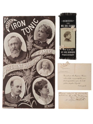 [HARRISON, Benjamin]. Memorial ribbon to Caroline Harrison, cabinet cards, and ephemera related to the family of Benjamin Harrison, comprising: