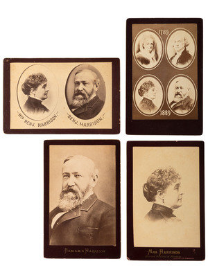 Four cabinet cards: one with the President and Mrs. Benjamin Harrison; one with just Mrs. Harrison; one with just Benjamin Harrison; and one with George and Martha Washington at top and the Harrisons below. At top, 1789, at bottom, 1889. Harrison was sometimes known as the "Centennial President" since his inauguration was 100 years after Washington's, which this card celebrates.