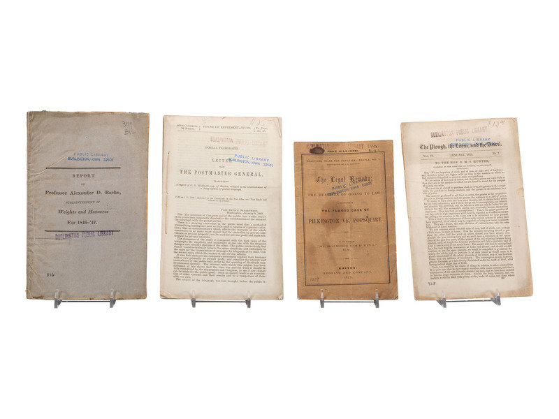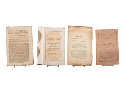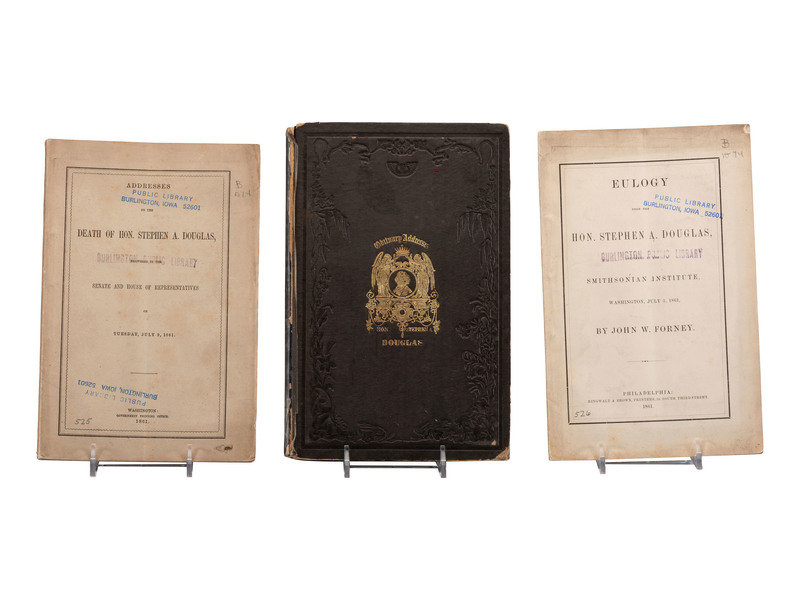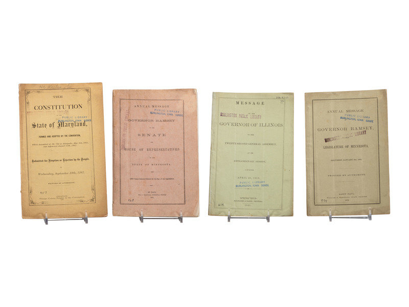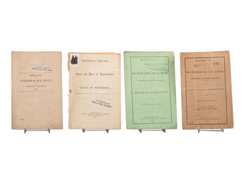 Obituary Addresses Delivered on the Occasion of the Death of Zachary Taylor, President of the United States, in the Senate and House of Representatives, July 10, 1850. Washington DC: William M. Belt, 1850. -- ALLSTON, Robert Francis Withers (1801-1884). Message No. 1 of His Excellency R.F.W. Allston, Governor of South Carolina, to the Senate and House of Representatives, at the Session of 1857. Columbia, SC: R.W. Gibbes, 1857. -- Addresses on the Death of Hon. Stephen A. Douglas, Delivered in the Senate and House of Representatives on Tuesday, July 9, 1861. Washington DC: Government Printing Office, 1861. Illustrated dark brown cloth gilt. -- YATES, Richard (1815-1873). Message of the Governor of Illinois to the TWenty-Second General Assembly at its Extraordinary Session, Convened April 23, 1861. Springfield: Bailhache & Baker, 1861. -- The Constitution of the State of Maryland, Formed and Adopted by the Convention, Which Assembled at the City of Annapolis, May 8th, 1867, and Adjourned August 17th, 1867. Annapolis: George Colton, 1867. -- Postal Telegraph. Letter from the Postmaster General, Transmitting A Report of G.G. Hubbard, esq., of Boston, relative to the establishment of a cheap system of postal telegraph. [Washington?]: N.p., 1869. -- And 12 others. Together, 18 pamphlets, all FIRST EDITION, 8vo, publisher's wrappers, Provenance: Burlington, Iowa Public Library, condition generally very good.