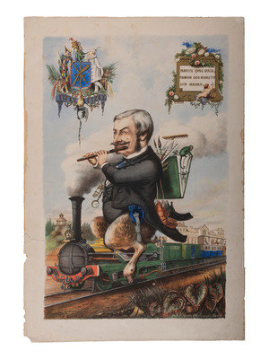 13.25 x 19.75 in. Unidentified character, half goat, riding on a circus train. On his back he has a portfolio, engraving tools, brushes, and gardening tools. There is a blue rosette ribbon at his waist and he is playing a flute. Upper left is a “coat of arms” with a shield with “ETZKY” below, above on one side is harlequin, the other side a jester, at top a monkey holding a jester rattle(?). Upper right is Latin “Parcite quos irrisi; primum ego memetip sum irrideo.” (Spare them whom I ridicule….) With small “Pilules Dorees” (golden pills) above the plaque in an oval. Lower right “Fac-Simile l’Aquarelles Becquei, Paris.”