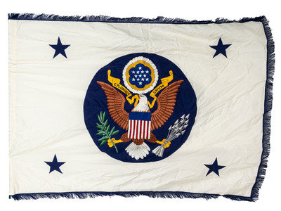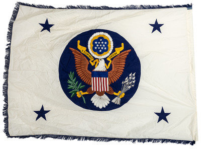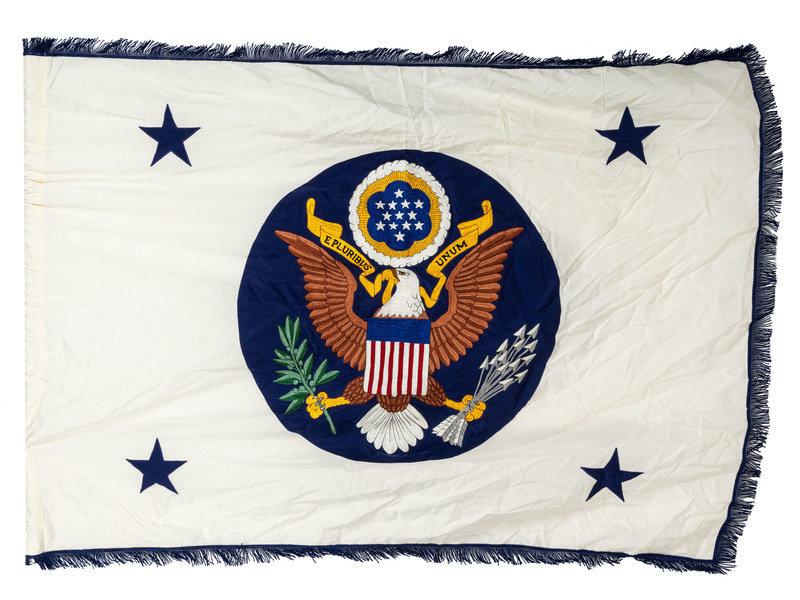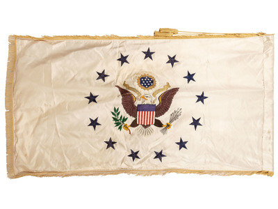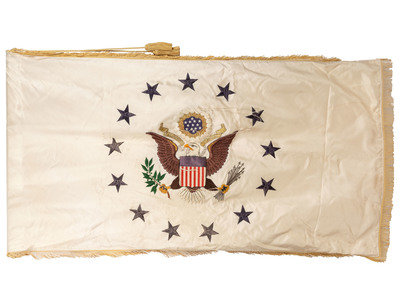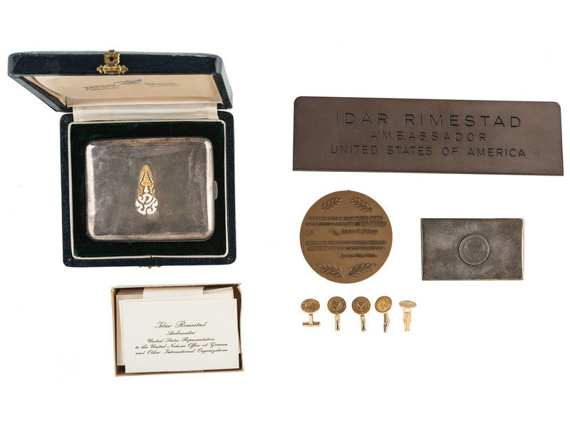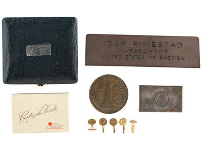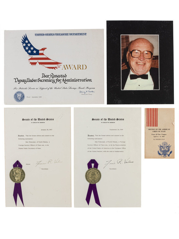 [With:] Two large diplomatic flags from the office of Idar Rimestad, each having the Great Seal of the United States centered medallion. United States Chief of Diplomatic Mission flag with 13 stars and gold fringe, approx. 34 x 64 in. (some pulled threads, light soil). Second with 4 blue stars and blue fringe, approx. 67 x 53 in. (small hole, light soil). -- Box of business cards for Rimestad: “Ambassador United States Mission...Geneva...” and "Ambassador United States Representative to the United Nations Office of Geneva and Other International Organizations.” -- Brass name placard from the office of “IDAR RIMESTAD AMBASSADOR United States of America.” -- Photograph of Rimestad. -- Two (2) political position award letters, one nominating Rimestad for Deputy Under Secretary of State signed by Secretary of US Senate Francis R. Valeo and another nominating him as Representative of the US to the European Office of the United Nations with rank of Ambassador, signed by Valeo. -- A U.S. Treasury Dept. award letter to Rimestad for Patriotic Service in the support of the US Bonds Program.