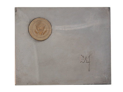 [Also with:] A small envelope embossed in upper left “White House” with handwritten notes on front "President Thieu" and "Gold Plaque to be included with gifts." Envelope contains a small blue tiffany bag and an engraved gold plaque, approx. 2 x 1 in., inscribed: "His Excellency Nguyen Van Thieu / President of the Republic of Viet-Nam / From / Lyndon B. Johnson [signed] / President of the United States of America / July 1968." -- Leonore Doskow hallmarked, sterling filled, handmade paperweight with the US State Department Eagle Seal. -- 4 sets of 14k yellow gold cufflinks with inscription: “U.S. State Department The United States of America” and hallmarked on back sides “r 14K.”-- A laminated contact list of White House and government contacts dated 3/20/68 and including Dean Rusk, 1961-69 Sec of State under JFK and LBJ, 1961-1969. -- “H. SENA Sterling .925” cigarette case hallmarked accordingly, with a gold and enamel emblem mounted on front with box, possibly original, from “THAI NAKOW…Bankok, Thailand Court Jeweler to the King.”