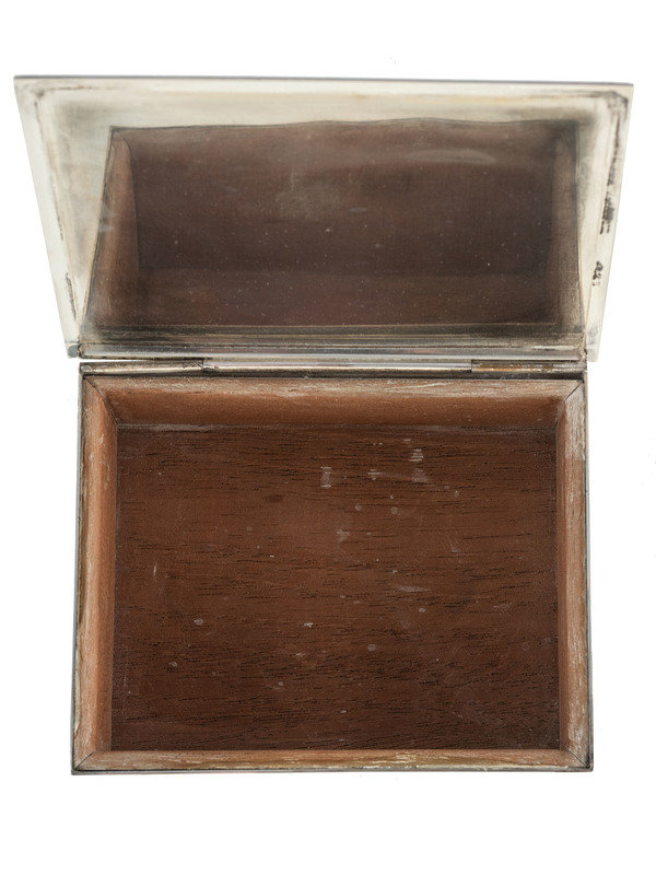 Sterling silver box with engraved gilt presidential seal on top left of hinged lid and engraved initials "LBJ" on bottom right of lid. Tiffany & Co. makers mark on underside along with pattern #23325 and engraved "Galt & Bro" silversmith mark. Wood-lined interior. Approx. 4 1/4 x 3 1/2 x 1 3/4 in. (scratches to surface, tarnish). Modern handwritten note accompanying box indicates that the box was a gift from President Johnson to Idar Rimestad, a diplomat who was appointed by Johnson as deputy undersecretary of state for administration in 1967.