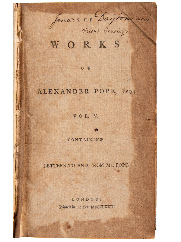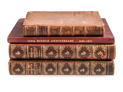 BIDDLE, Nicholas. Biddle Anniversary: Celebrating the 250th Anniversary of the Arrival in America of William and Sarah Kempe Biddle. Philadelphia: The Engle Press, [1931]. 8vo. Frontispiece, plates, some folding. (Minor even toning.) Original publisher's maroon cloth gilt (scuffs, spine lightly sunned). LIMITED EDITION numbered 178 of 300. SIGNED AND INSCRIBED BY THE AUTHOR TO GENERAL BIDDLE: "To Maj. General John Biddle with Compliments of Nicholas Biddle." -- The Works of Alexander Pope, Esq. London: N.p., 1772. Volume V only. 12mo. (Toned, spotted). Near contemporary calf, gilt spine in 6 compartments with 5 raised bands, with red morocco spine label gilt-lettered. Provenance: William S. Biddle. (Ownership inscription "W.S. Biddle" to front interior board). -- [BIDDLE, Richard (1796-1847)]. A Memoir of Sebastian Cabot; With A Review of the History of Maritime Discovery. Philadelphia: J.B. Lippincott Company, 1915. 2 volumes, 8vo. Plates. (Some offsetting). Half dark brown morocco, spine in 6 compartments with 5 raised bands, gilt-lettering in 1, others gilt-decorated. Reprint edition. With presentation card from the author's son, Charles Biddle.