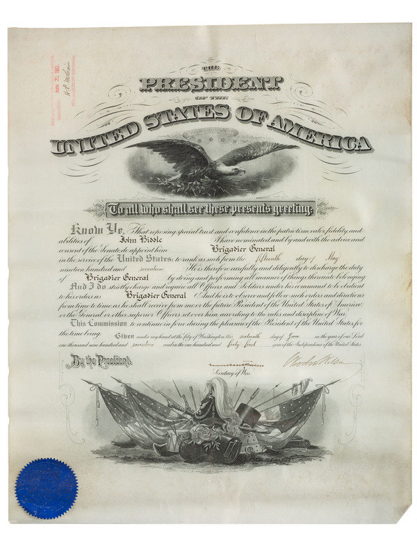 WILSON, Woodrow (1856-1924). Document signed ("Woodrow Wilson") as President. Washington, DC, 16 June 1917. 19 1/4 x 15 3/4 in. (rolled, toning to edge lines, light soil). Wilson appoints "John Biddle" to the rank of Brigadier General just months after the US entered WWI. Countersigned by Secretary of War Newton Baker.