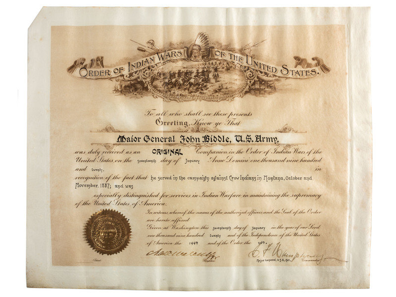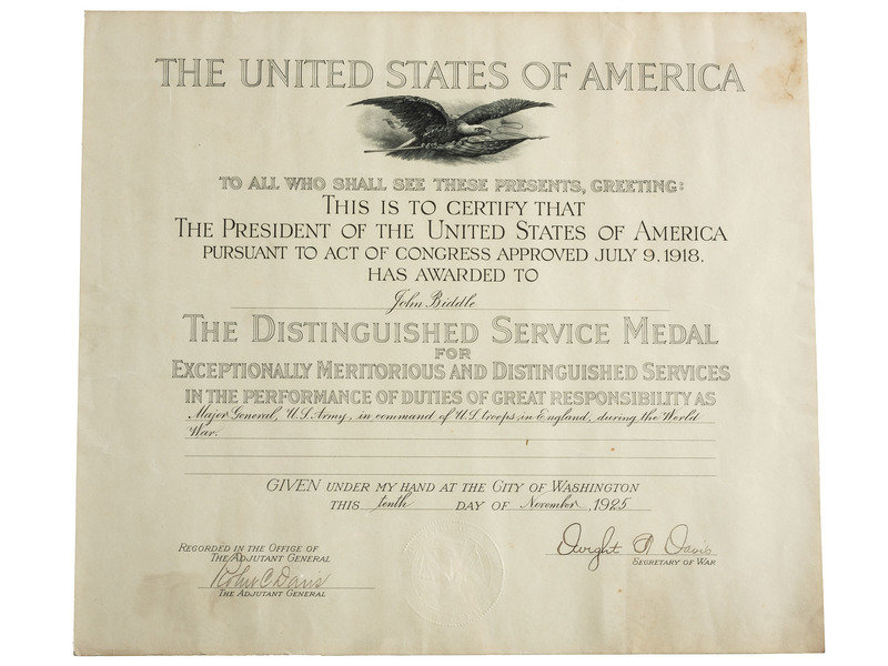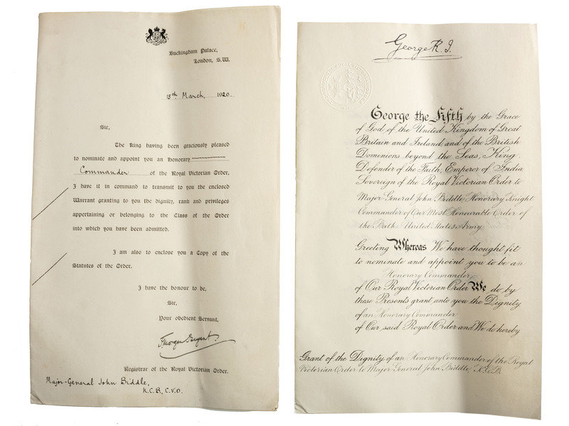 Original bestowal document naming Major General John Biddle an honorary Commander of the Royal Victorian Order, signed by King George V ("George R.J."), St. James, 1 December 1919 with Buckingham Palace transmittal letter signed by F. Morgan Bryant, 15 March 1920. Also with the 1918 "Statutes of the Royal Victorian Order." -- Certificate signed by Secretary of War Dwight F. Davis certifying that "The President of the United States of America ... has awarded to John Biddle the Distinguished Service Medal for Exceptionally Meritorious and Distinguished Services ... as Major General, US Army, in command of the US troops in England, during the World War." 10 November 1925. -- Certificate acknowledging Major General John Biddle as an original companion in the Order of Indian Wars of the United States, 17 January 1920, and noting his service in the "campaign against the Crows Indians in Montana, October and November, 1887...." -- Commemorative plaque commemorating the christening of the dredge "Biddle" in 1946. -- Newspaper clippings, miscellaneous personal documents, pins, decorative jewelry, 6 1/2 x 4 3/4 in. photograph, possibly showing Biddle in uniform shaking hands with a soldier.