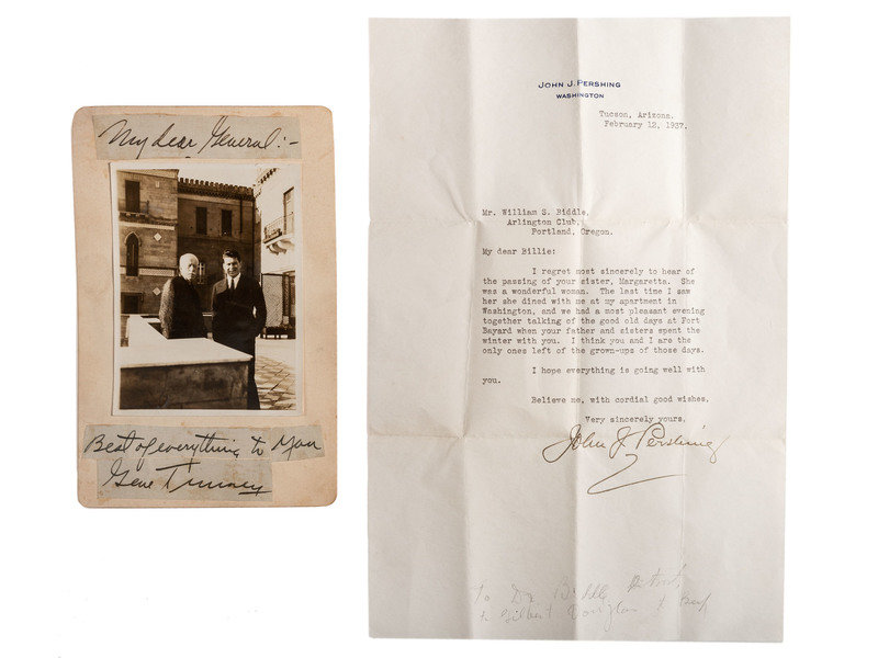 TUNNEY, James Joseph "Gene" (1897-1978). Clipped noted signed ("Gene Tunney") to General Biddle. Hotel Villa Sqiea, Palermo, February 1931. Note reads "My dear General:- Best of everything to you, Gene Tunney," alongside a snapshot of Biddle and Tunney in an outdoor courtyard. Tunney, best remembered as a boxer, enlisted with the Marine Corps in WWI and served with the 11th marine Regiment in France and Germany. He remained in the Marine Corps Reserve, reaching the rank of major in the Connecticut Naval Militia. At the outbreak of WWII, he accepted a commission to the Naval Reserve as a lieutenant commander to head the navy's physical fitness program.
