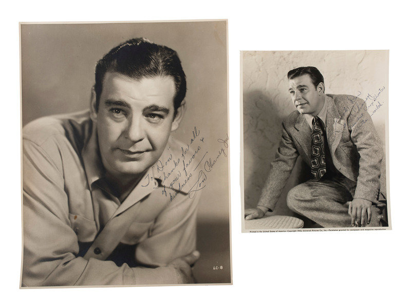 [With:] Two autographed Lon Cheney, Jr. photos, one 10-1/2 x 13-1/2 in., "To 'Don'/ Thanks for all of your favors & kindness---- / Lon Chaney Jr."; second 77-3/4 x 9-3/8 in., "Luck Don / Lon Chaney / the best Crap Shooter in the world." (One large "L" for "Luck" and "Lon.")