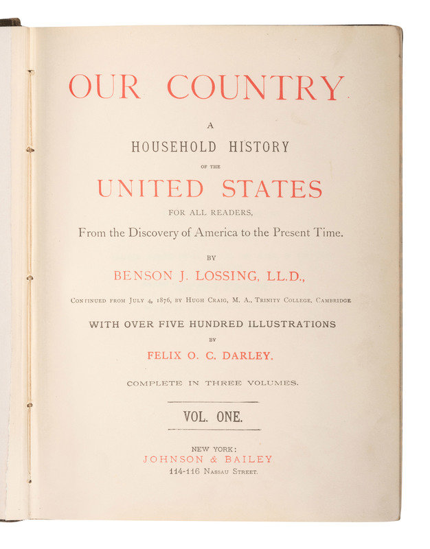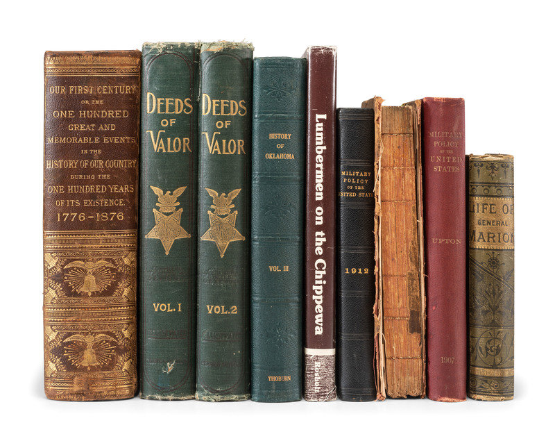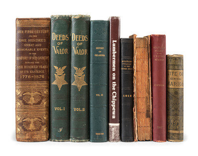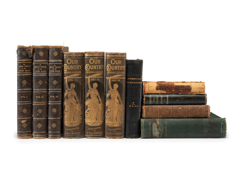 DARLEY, Felix O.C. Our Country: A Household History of the United States for All Readers. New York: Johnson & Bailey, 1895. 3 volumes. -- LEE, Henry. Memoirs of the War in the Southern Department of the United States. Washington: Peter Force, 1827. Second edition. (Boards detached.) Sabin 39742. -- SHEA, John Gilmary. A Child's History of the United States. New York: MCMenamy, Hess & Co. 1872. 3 volumes. -- MYER, Albert J. A Manual of Signals: For the Use of Signal Officers in the Field. New York: D. Van Nostrand, 1868. Illustrated red morocco gilt (boards detached, heavy losses to spine, wear to extremities). -- DEVENS, R.M. Our First Century. Springfield, MA and Easton, PA: C.A. Nichols & Co. and J.W. Lyon, 1876. -- And 10 others. Together 15 works in 20 volumes, 8vo and 4to, bindings as described, condition generally good, except as noted.