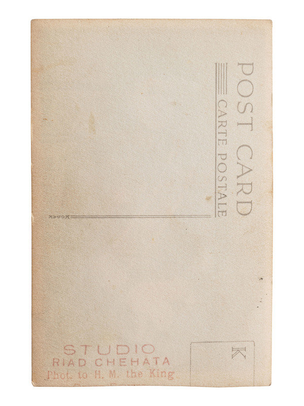 With “Post Card” and “Carte Postale” on verso. “Studio Riad Chehata / Phot. To H.M. the King.” Three-quarter length image of Farouk in military uniform, hand on hilt of sword. Signed “Farouk R.”
