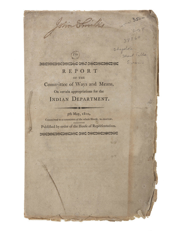 Report of the Committee of Ways and Means, On certain appropriations for the Indian Department. 5 May 100. Committed to a committee of the whole House, to-morrow. Published by order of the House of Representatives. [Washington], 1800. 8vo, untrimmed, no covers, 12 pp. In custom cloth and board envelope.