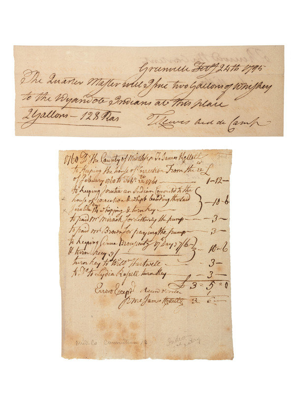 Manuscript order, “Greenville, Feby. 24th 1795. The Quarter Master will give two gallons of whiskey to the Wyandote Indians at this place. T. Lewis aid de camp.” Approx. 2.75 x 8 in.