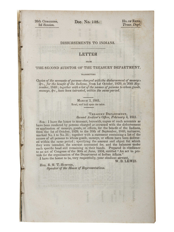 Disbursements to Indians. Letter from the second auditor of the Treasury Department, Transmitting Copies of the accounts of persons charged with the disbursement of moneys, &c., for the benefit of the Indians…. Ho. Of Reps. Treas. Dept. Doc. No. 108, 26th Congress, 2d session. 8vo, disbound, 111pp.