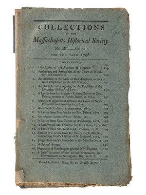 Collections of the Massachusetts Historical Society. Boston: Samuel Hall, 1798. Vol. V, No. III, pp 149-220. 8v, printed wraps. Several entries relate to Indians seeking peace and declare themselves loyal subjects of the King of England (documents with 1671 dates). (wraps separated)
