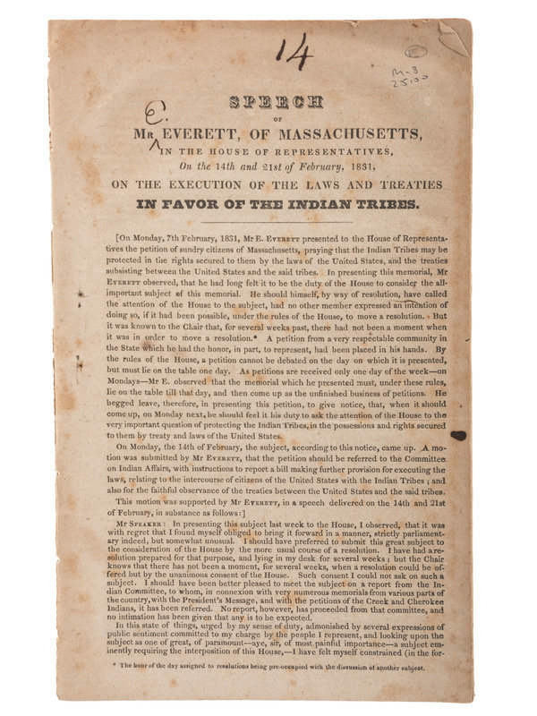 Speech of Mr. [E] Everett, of Massachusetts, in the House of Representatives, On the 14th and 21st of February, 1831, On the Execution of the Laws and Treaties in Favor of the Indian Tribes. 8vo, disbound, 21pp.