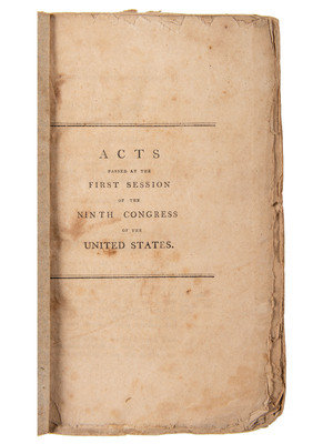Acts Passed at the First Session of the Ninth Congress of the United States. Dec. 2, 1805. Washington: 1806. 8vo, original plain wraps as issued, 207, vi pp. Uncut. Contains Indian treaties, including “Pottawatimies” and “Miamies.” (The second session of this Congress passed the first laws abolishing importation of slaves – not in this volume. A significant legislative Congress.)