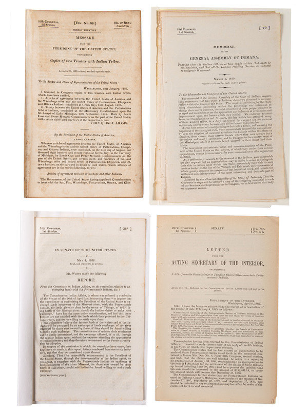 Memorial of the General Assembly of Indiana, Praying that the Indian title to certain lands within that state be extinguished, and that all the Indians residing therein, be induced to emigrate Westward. March 4, 1830. 21st Congress, 1st Session, Plus Memorial of the Legislature of Indiana, to obtain the extinguishment of the title of the Pottawatamie and Miami Indians to land in that State, and the removal of said Indians from that State. 24th Congress, 1st Session. And Johnson, Israel. Report: The Committee on Indian Affairs, t which was referred the petition of Israel Johnson, of Cass county, Indiana, report;… House of Reps., No. 505, 30th Congress, 1st session.