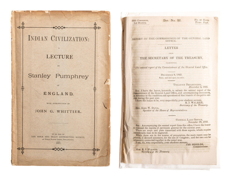 Indian Civilization: A Lecture by Stanley Pumphrey of England. With Introduction by John G. Whittier. Philadelphia: The Bible and Tract Distributing Society, 1877. 8vo, printed wraps, 52pp. With folding map Indian Territory 1876, approx. 24 x 30 in., hand colored (colors fading). Map based on the first edition of a series of Land Office maps, now uncommonly encountered, showing the lands assigned to the various tribes along with information about the treaties which led to the formation of the reserve. Also includes early forts, roads, trails, etc. (wraps brown around edges, water stain lower edge, chipping where brown)