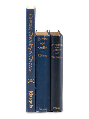 CUSTER, Elizabeth B. "Boots and Saddles" or Life in Dakota with General Custer. New York and London: Harper & Brothers, 1885. Second issue with frontispiece portrait and map. -- KING, Charles. Campaigning with Crook and Stories of Army Life. New York: Harper & Brothers, 1890. -- MARQUIS, Thomas. Custer, Cavalry & Crows: The Story of William White as told to Thomas Marquis. Ft. Collins, CO: The Old Army Press, 1975. -- Together, 3 works in 3 volumes, 8vo and 4to, all in publisher's bindings, condition generally very good.