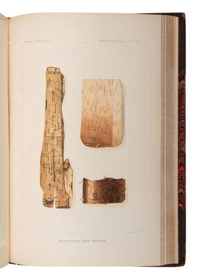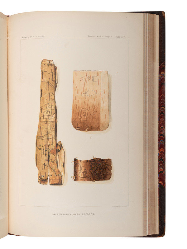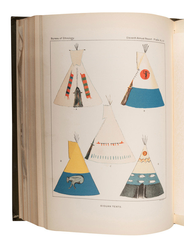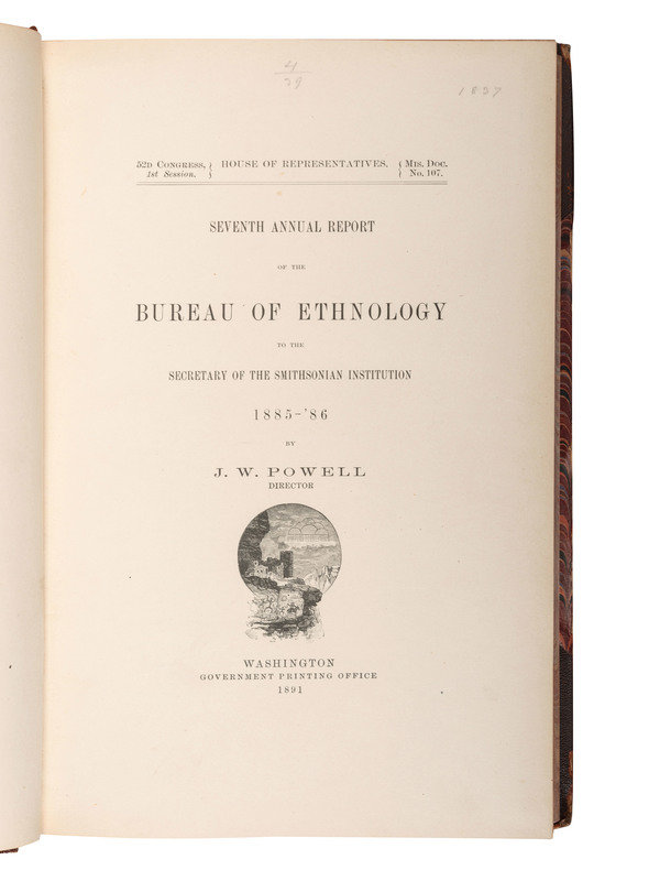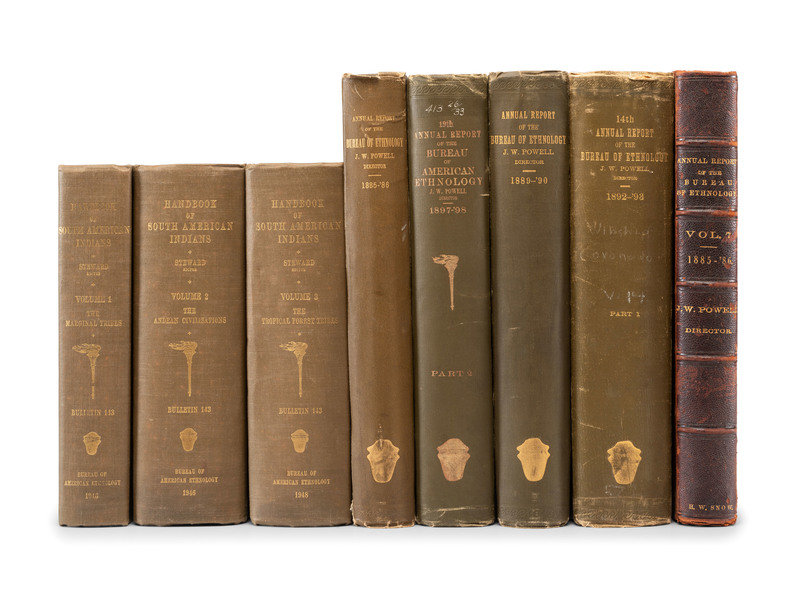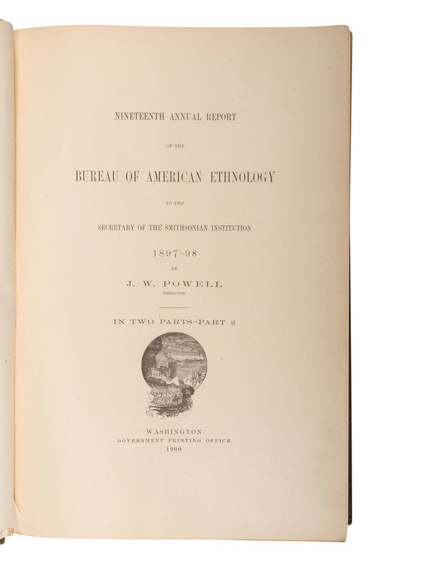POWELL, J.W. Seventh Annual Report of the Bureau of Ethnology to the Secretary of the Smithsonian Institution 1885-'86. Washington: Government Printing Office, 1891. One-half morocco with marbled boards, spine in 6 compartments with 5 raised bands, gilt lettering in 4. 52d Congress, 1st Session. Mis. Doc. No. 107. -- Eleventh Annual Report of the Bureau of Ethnology to the Secretary of the Smithsonian Institution 1889-'90. 1894. -- Fourteenth Annual Report of the Bureau of Ethnology to the Secretary of the Smithsonian Institution 1892-93. Part 1 only (of 2). 1896. -- Nineteenth Annual Report of the Bureau of Ethnology to the Secretary of the Smithsonian Institution 1897-'98. Part 2 only (of 2). 1900. -- Together, 5 works in 5 volumes, including a second copy of Seventh Annual Report in publisher's green cloth gilt, 4to, all Washington DC: Government Printing Office, all in publisher's olive green cloth gilt, except as noted, condition generally fine.
