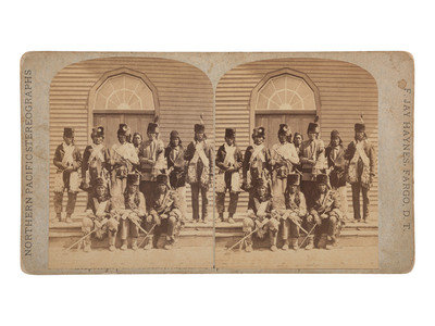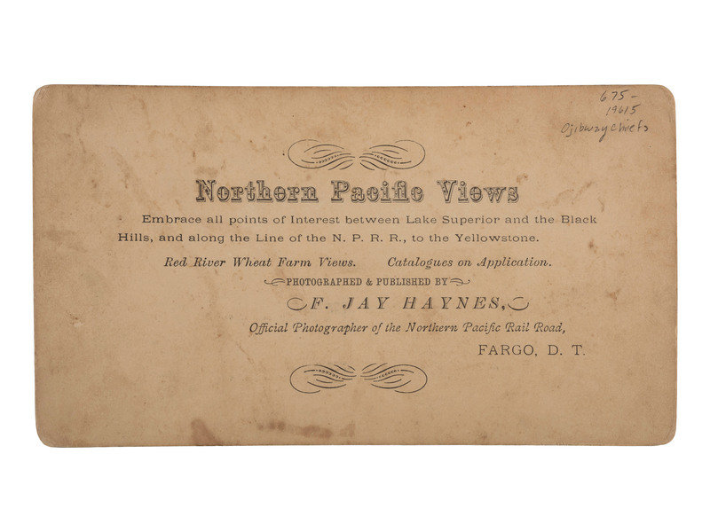 Northern Pacific Stereographs, Fargo, Dakota Territory. Penciled on verso "Ojibway Chiefs." With printed advertising for F. Jay Haynes as Official Photographer of the Northern Pacific Rail Road. Image of ten Native Americans, all except one wearing fur headgear. Three seated in front hold a pipe, a tomahawk and a spear(?). The six standing behind have pipe bags and other objects. (One man is behind everyone and difficult to see.)
