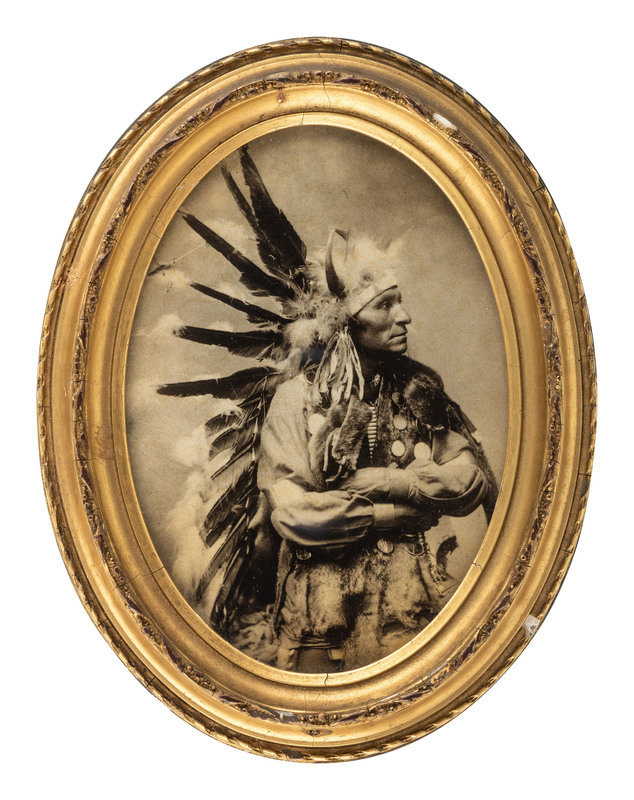 A striking portrait of Little Horse of the Oglala Sioux tribe dressed in his ceremonial garb which includes headdress, buffalo bone vest, and animal pelts. The original image was taken around 1899 by a member of the Heyn family, (likely Herman) working photographers active in Omaha.