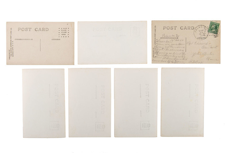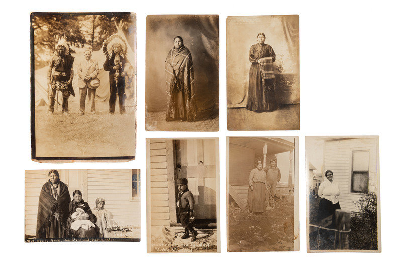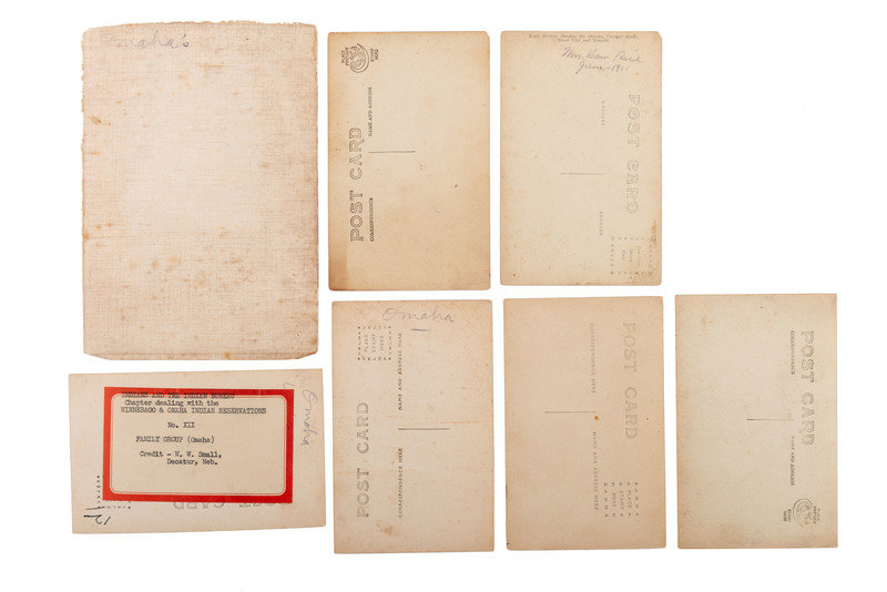 [Also with:] 7 photographs/postcards of subjects identified as Omaha Indians, including: 7 x 5 in. albumen photograph with linen backing showing two men in feather headdresses, one man with eagle fan and one in beaded loincloth with an Anglo man in a suit standing between them (toning, corner and edge wear, including some loss to corners). -- Real photo postcard “Three Generations of Omaha Indians, Mrs. Henry Wood, Daughters and Grandchild,” written in the negative, “Family Group Omaha Credit W. W. Small, Decatur, Neb.” typed on the verso. -- Real photo postcard of a young boy in a cap “ Master David Tyndall, “Little Woodtick” written in the negative (horizontal crease in image). -- Real photo postcard by Kozy Studio, Omaha featuring a portrait of a woman holding a shawl identified as Mrs. Dan Rice on the verso. -- 3 real photo postcards, one of a formal standing portrait of a woman, one of a couple in front of a porch, and one of a woman in front of a clapboard house.