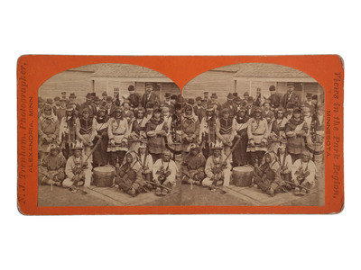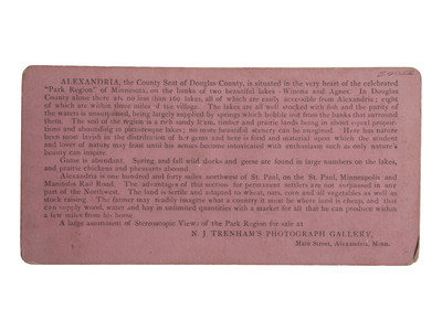 Arched top stereoviews on orange mount with "N.J. Trenham, Photographer, Alexandria, Minn. / Views in the Park Region, Minnesota." Verso with description of Douglas County, of which Alexandria is the county seat. It is essentially an ad for the region extolling its resources, game, scenery, etc. No mention of the native peoples.