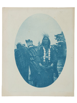 Cyanotype with approx. 3 x 4 in. oval image with front view of one man and several others in background. One of the men in the background wears a headdress with vertical feathers.