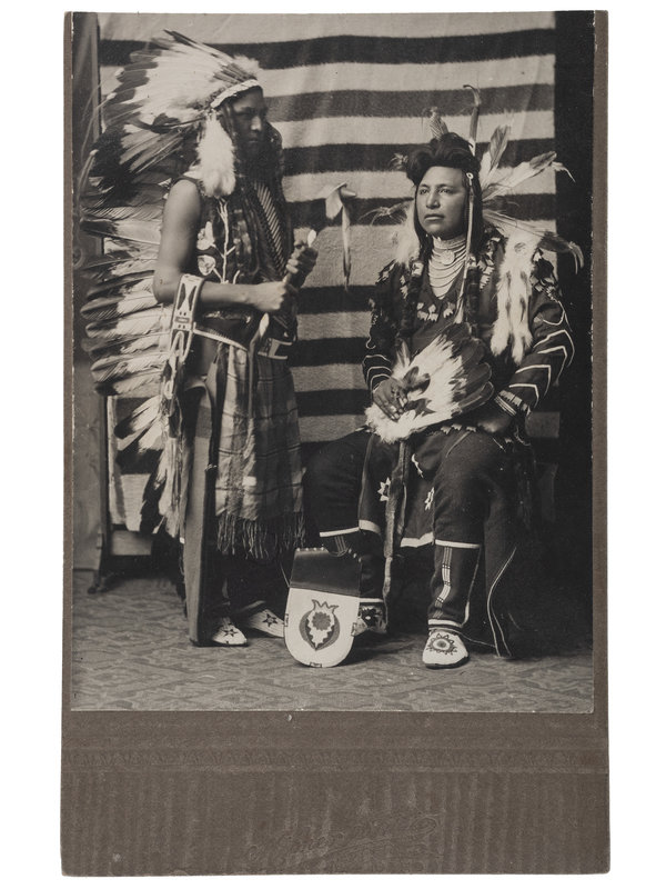 Cabinet card with two men in full Plains regallia - fether headdresses, beaded strips, beaded vest, hairpipe breastplate, feather fan, beaded moccasins, and more. With blindstamp of "Misher Studio / Nez Perce, Idaho."
