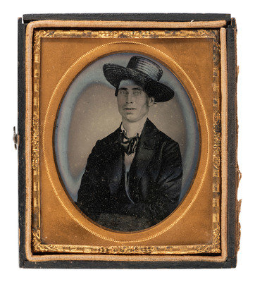 [INDIAN TERRITORY]. Sixth plate ambrotype portrait of man in straw hat.