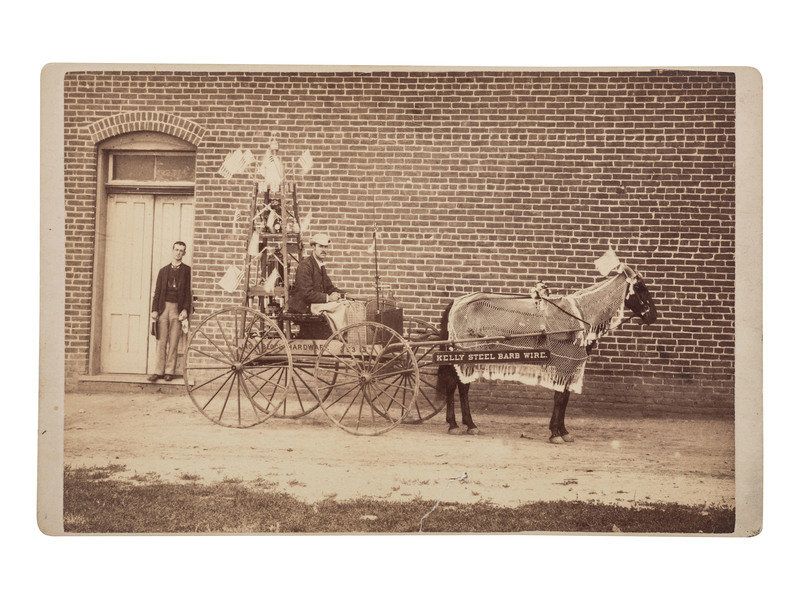 Outdoor image showing a wagon with a display of hardware items and U. S. Flags pulled by a small horse with a fringed blanket. Signs on the rig read: “John H. Blood Hardware 353 15th” and “Kelly Steel Barb Wire.” Mautz pg. 184.