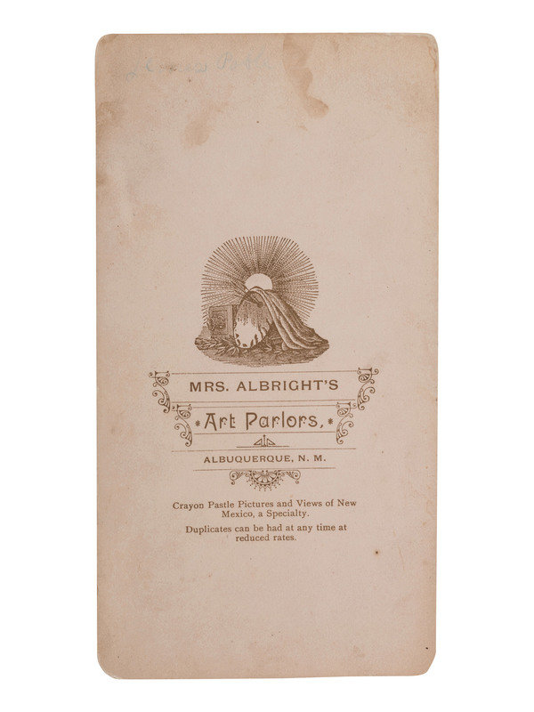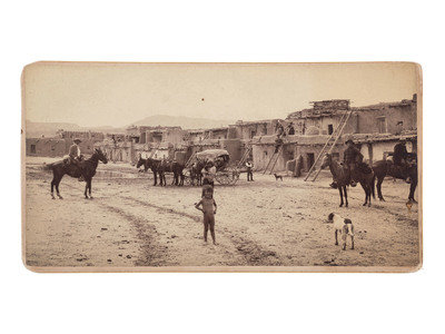 7 1/4 x 3 3/4 in. albumen photograph on cardstock mount (light toning and surface soiling to image, with noticeable brown spot to upper portion; wear and soiling to mount edges and corners). Mrs. Albright's Art Parlors pictorial imprint on verso. Image features the Pueblo plaza with a supply wagon, mounted riders, dogs, and children visible.
