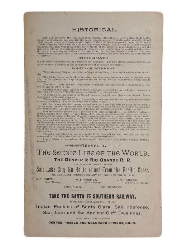 7 1/8 x 4 3/8 in. albumen boudoir cabinet photograph on black card with gold printing. (A few light spots.) Photographer's imprint, series title, and advertising copy printed on mount recto. Verso includes printed historical information and advertisement for the Denver & Rio Grande R. R. and the Santa Fe Southern Railway.