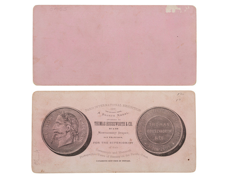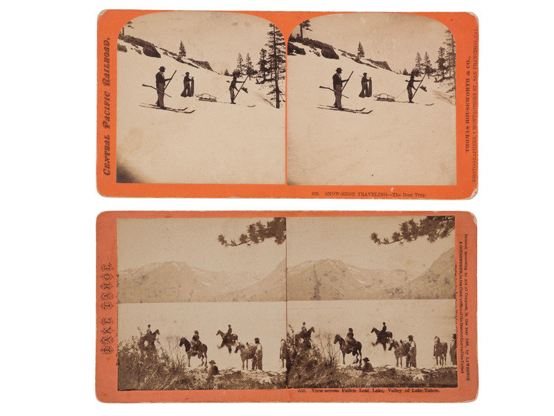 Stereoview No. 839 (light soiling; some corner and edge wear to mount, including minor surface abrasion to mount verso). Photo taken along the Central Pacific Route near Oroville. “Central Pacific Railroad. Thomas Houseworth & Co. Photographer, San Francisco, Cal.” printed on the front margins. Mautz pg. 111. The view shows men on skis pulling an enormous bear trap on a small sled. -- View across Fallen Leaf Lake, Valley of Lake Tahoe. Ca 1866. Stereoview No. 650 (light spotting; some corner and edge wear to mount). An image showing rides in and out of the lake at the shore. “Lake Tahoe” and publishing information printed on the front margins. With “Thomas Houseworth & Co. 317 & 319 Montgomery Street, San Francisco” and information about receiving a bronze medal at the Paris International Exhibition in 1867 printed on the verso. Mautz pg. 111.