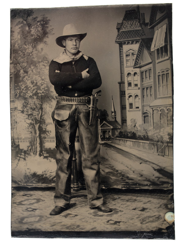 Full-length studio portrait of man wearing a bandana, brimmed hat, and holstered handgun and ammunition belt. 2 1/4 x 3 3/8 in. tintype (excellent contrast and clarity, small loss to emulsion to lower-left corner).