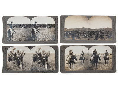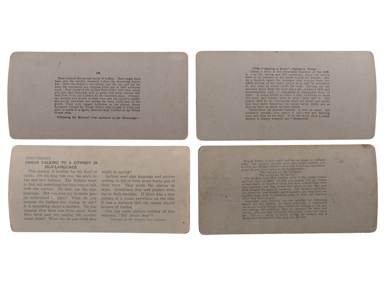 [With:] 12475 - Round-up on the Sherman Ranch, Genesee, Kan., U.S.A. 1902. -- 13643 - Cowboys on the Range-An Autumn Beef Roundup, Montana, U.S.A. 1904. -- 13756 - "Making a Drive" - ON the Paloduro Ranch, Paloduro, Texas, U.S.A. 1905. -- P-V23247 - Indian Talking to a Cowboy in Sign Language. Underwood & Underwood. N.d.-- Together, 4 stereoviews, Meadville, PA: Keystone View Company, all B.L. Singley, except as noted, mounts with slight curl.
