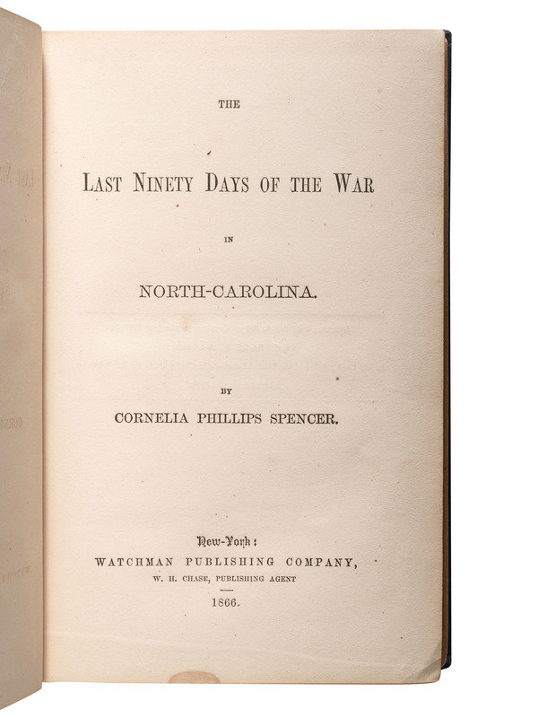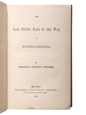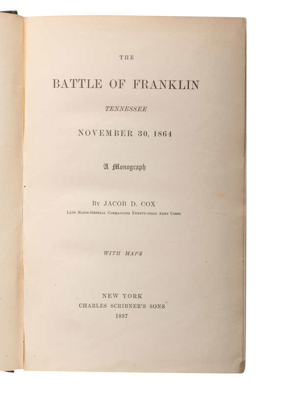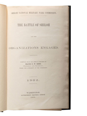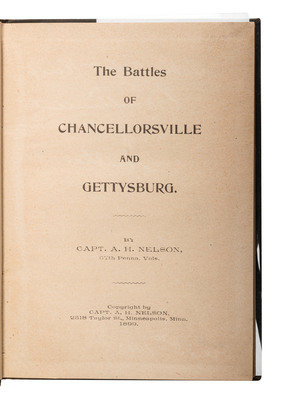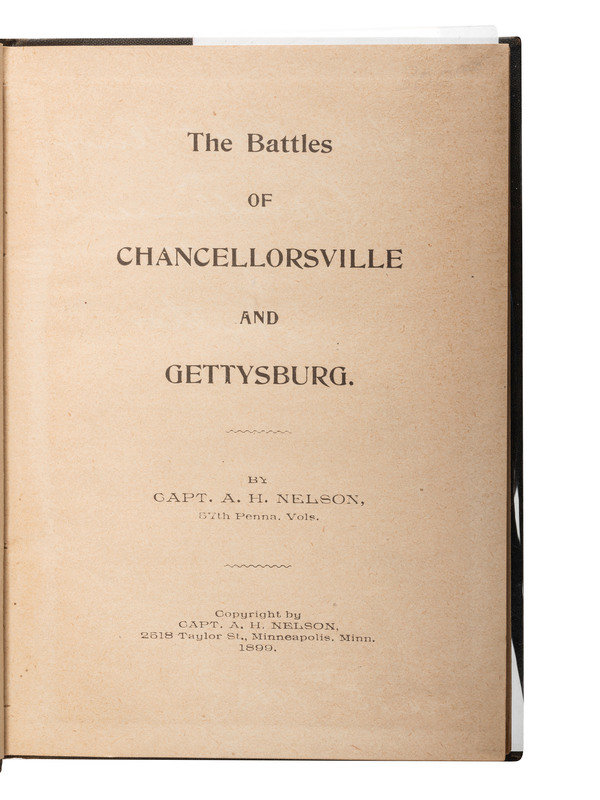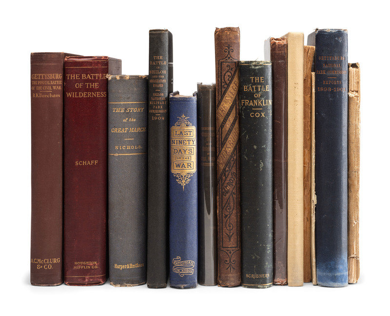 NELSON, Alanson H. The Battles of Chancellorsville and Gettysburg. Minneapolis, MN: By the Author, 1899. INSCRIBED BY THE AUTHOR, a veteran of the 57th Pennsylvania Infantry, enlisted on 1 November 1861 as a 1st lieutenant and commissioned into Co. K the same day. Promoted to captain on 17 June 1862, mustered out on 4 November 1864. -- SPENCER, Cornelia Phillips. The Last Ninety Days of the War in North-Carolina. New York: Watchman Publishing Company, 1866. -- OLDROYD, Osborn H. A Soldier's Story of the Siege of Vicksburg. Springfield, IL: Published for the Author, 1885. Oldroyd was a sergeant of co. E 20th Ohio. -- COX, Jacob D. The Battle of Franklin Tennessee November 30, 1864. New York: Charles Scribner's Sons, 1897. -- REED, D.W. Shiloh National Military Park Commission. The Battle of Shiloh and the Organizations Engaged. Washington: Government Printing Office, 1903. Provenance: George E. Thompson IV (blindstamp to endpaper). -- And 9 others. Together, 14 works in 14 volumes, all FIRST EDITION, 8vo and 12mo, all in publisher's cloth bindings, condition generally very good.