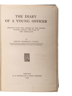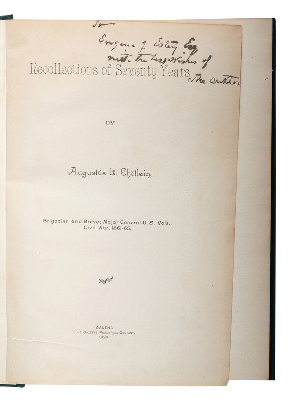 FAVILL, Josiah Marshall. The Diary of a Young Officer Serving with the Armies of the United States During the War of the Rebellion. Chicago: R.R. Donnelley & Sons Company, 1909. Provenance: Wisconsin Historical Society (library markings). Favill enlisted on 21 September 1861 in New York City as a 2nd lieutenant and was commissioned into Co. E of the 57th New York Infantry on 12 November 1862. He was promoted several times, ultimately to captain on 14 November 1863, and mustered out on 11 August 1864. -- CHETLAIN, Augustus L. (1824-1914). Recollections of Seventy Years. Galena: The Gazette Publishing Company, 1899. INSCRIBED BY THE AUTHOR, a general and the first man to volunteer in Illinois. -- BILLINGS, John D. (1842-1933). Hardtack and Coffee or The Unwritten Story of Army Life. Boston, etc.: George M. Smith & Co., 1888. Second edition. Billings enlisted as a private on 16 August 1862 and was mustered into the 10th Massachusetts Light Artillery on 9 September 1862. He was promoted to corporal on 3 November 1864 and mustered out on 9 June 1865 at Galloup's Island, Boston. A member of several GAR posts and served as post commander of Post #94 (Revere) and Department of Massachusetts Commander. -- GOSS, Warren Lee. Recollections of a Private. A Story of the Army of the Potomac. New York: Thomas Y. Crowell & Co., 1890. Goss enlisted on 19 November 1861 as a private and was mustered into Co. B of the US Army Engineer Corps on the same day. He was discharged for disability on 15 November 1862 before mustering into Co. H of the 2nd Massachusetts Heavy Artillery on 7 December 1863. Listed as a POW on 20 April 1864 in Plymouth, NC, and exchanged on 16 December 1864. Mustered out on 11 September 1865. -- NOTT, Charles C. Sketches of the War: A Series of Letters to the North Moore Street School of New York. New York: Anson D.F. Randolph, 1865. Second Edition. Sabin 56032. Nott enlisted on 28 August 1861 as a captain and was commissioned into Co. E of the 5th Iowa Cavalry on the same day. After being thrown from a horse, he was discharged for disability on 5 May 1862. He was commissioned in F&S as a lieutenant colonel of the 131st New York Infantry on 28 October 1862, was promoted to colonel and transferred to the 176th New York Infantry. He was listed as a POW at 23 June 1863 at Brashear City, LA, paroled on 22 June 1864, and mustered out on 8 August 1864. -- And 10 others. Together, 15 works in 15 volumes, all FIRST EDITION except as noted, 8vo, publisher's cloth, condition generally good.