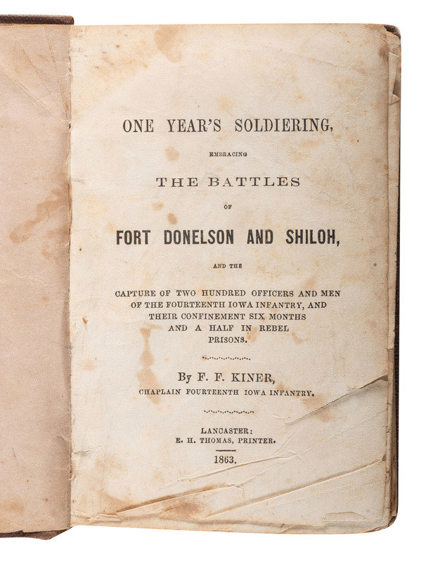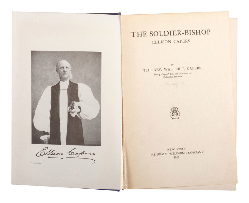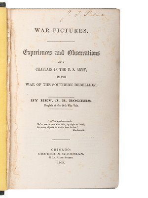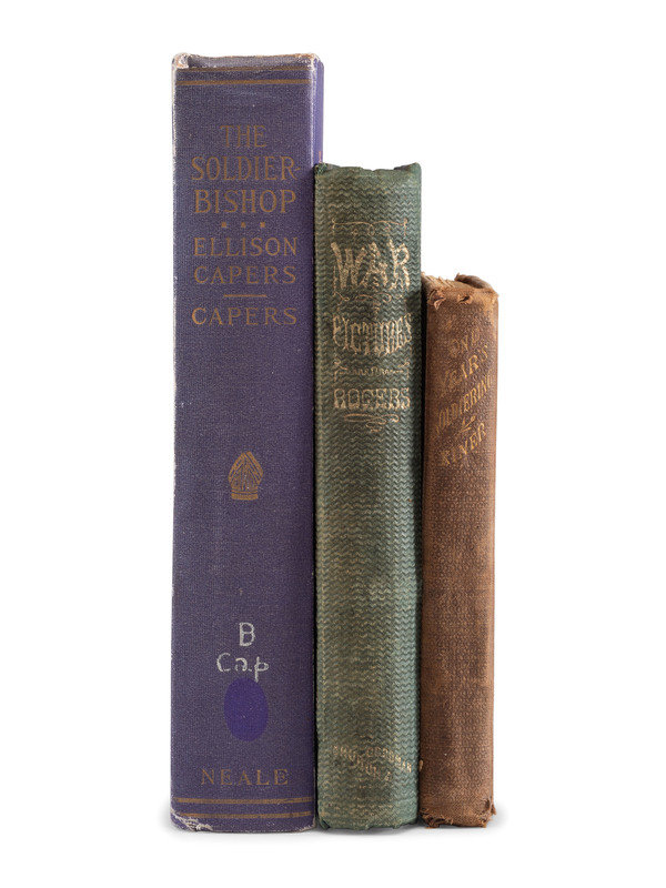 CAPERS, Walter B. The Soldier-Bishop Ellison Capers. New York: The Neale Publishing Company, 1912. Biography of Confederate General and theologian Ellison Capers (1837-1908) by his son. -- KINER, Frederick F. One Year's Soldiering Embracing the Battles of Fort Donelson and Shiloh. Lancaster, [PA?]: E.H. Thomas, 1863. Kiner enlisted on 5 October 1861 as a 1st sergeant with the 14th Iowa Infantry and was promoted to chaplain on 21 April 1863. Confined as a POW on 6 April 1862 at Shiloh, paroled on 17 October 1862 at Aiken's Landing, VA. -- ROGERS, J.B. War Pictures. Experiences and Observations of a Chaplain in the U.S. Army, in the War of the Southern Rebellion. Chicago: Church & Goodman, 1863. Rogers enlisted on 2 December 1861 as a chaplain with the 14th Wisconsin Infantry. He was promoted to captain and transferred to Co. C of the 64th USCT on 14 December 1863 but died of disease on 1 July 1864 at Davis' Bend, LA. -- Together, 3 works in 3 volumes, all FIRST EDITIONS, 8vo and 32mo, all in publisher's cloth, condition generally good.