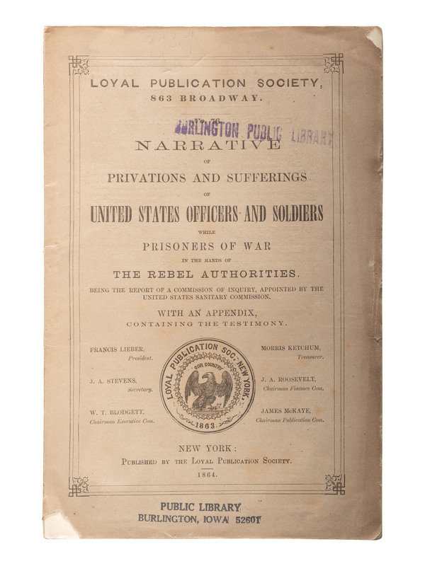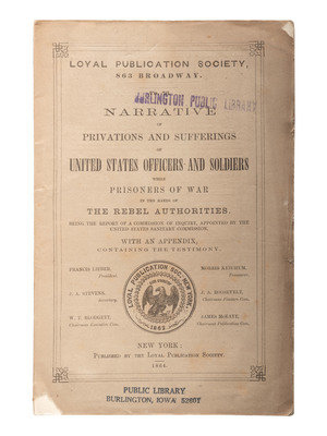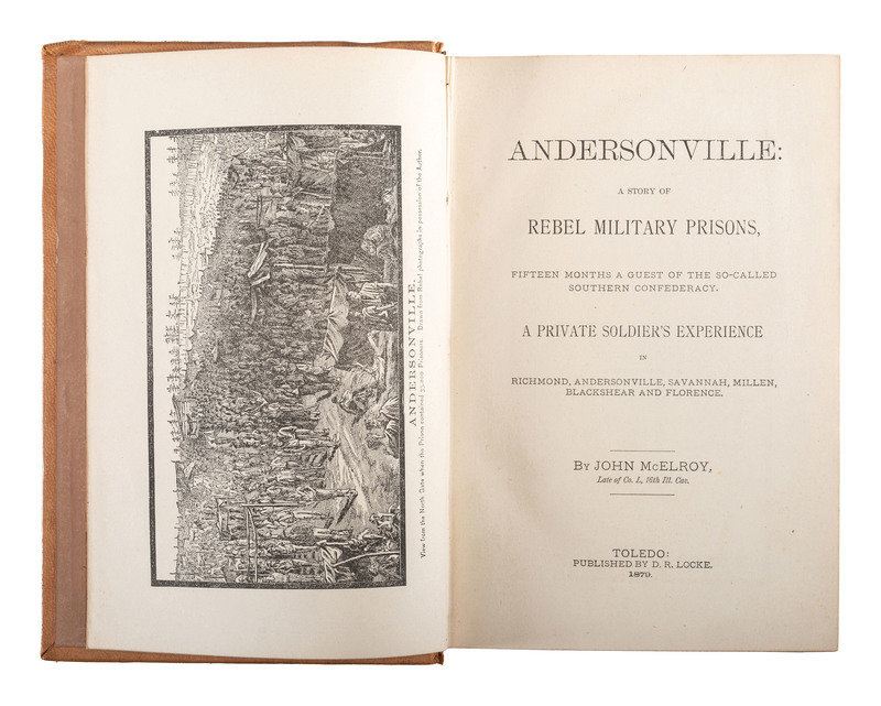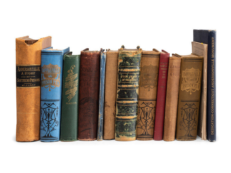 McELROY, John. Andersonville: A Story of Rebel Military Prisons. Toledo, OH: D.R. Locke, 1879. Full sheep with gilt morocco spine label. -- Narrative of Privations and Sufferings of United States Officers and Soldiers while Prisoners of War in the Hands of the Rebel Authorities. New York: The Loyal Publication Society, 1864. Original wrappers. Featuring engraved illustrations after disturbing photographs of emaciated prisoners of war. -- ELY, Alfred. LANMAN, Charles, editor. Journal of Alfred Ely, A Prisoner of War in Richmond. New York: D. Appleton and Company, 1862. -- BROWNE, Junius Henri. Four Years in Secessia: Adventures Within and Beyond the Union LInes. [Hartford, CT]: [O.D. Case and Company], [1865]. (Lacking title page and preliminaries.) One-quarter dark green morocco by W. Bent Wilson, LaFayette, IN. -- URBAN, John W. Battle Field and Prison Pen, or Through the War, and Thrice a Prisoner in Rebel Dungeons. [Philadelphia]: Hubbard Brothers; Edgewood Publishing Company, 1882. 2 copies. -- And 7 others. Together 13 works in 13 volumes, all FIRST EDITION, except as noted, 8vo, publisher's cloth except as noted, condition generally good.
