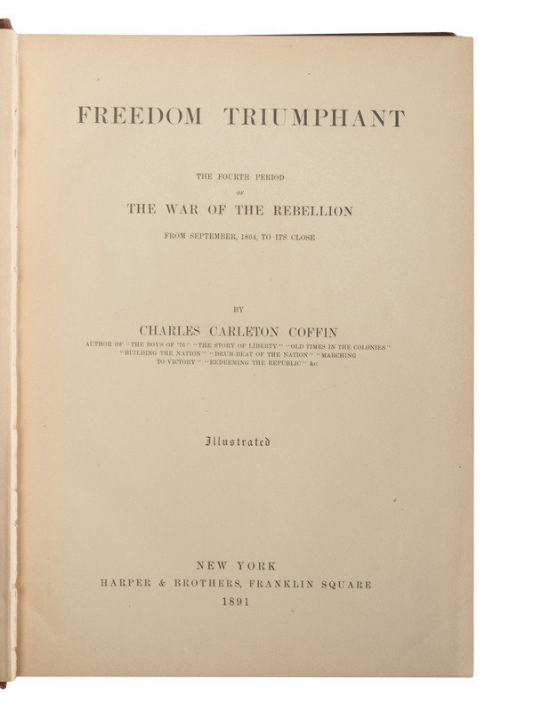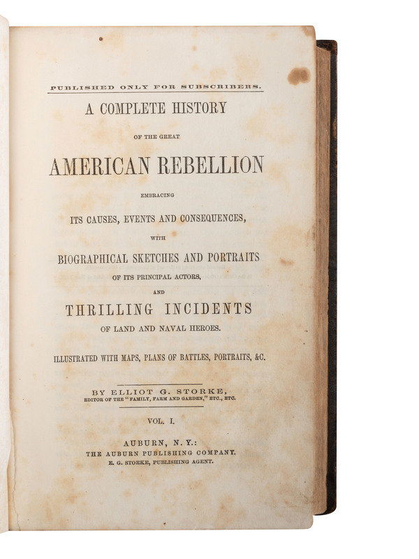STORKE, Elliot. A Complete History of the Great American Rebellion. Auburn, NY: The Auburn Publishing Company, 1863. 2 volumes. Original illustrated morocco gilt, rebacked with partial original spines laid down. -- HAMERSLY, Thomas H.S. Complete Regular Army Register of the United States: For One Hundred Years, (1779-1879). Washington DC: T.H.S. Hamersly, 1881. Third edition. Later red cloth. Inscribed "Charles A. Hamilton / M.O.L.L.U.S. of Milwaukee, Wis." -- COFFIN, Charles Carleton. Drum-Beat of the Nation: The First Period of the War of the Rebellion from its Outbreak to the Close of 1862. New York; Harper & Brothers, 1888. 2 volumes. -- BLAKE, W.O. Pictorial National Records: Embracing Descriptions of European and Asiatic Nations: A Statistical View of the United States of America; and a History of the Great Rebellion. Columbus: Gilmore and Brush, 1863. 2 volumes. -- STINE, J.H. History of the Army of the Potomac. Washington DC: Gibson Bros., 1893. INSCRIBED BY THE AUTHOR to front free endpaper. -- And 14 others. Together, 19 works in 22 volumes, 8vo and 12mo, most in publisher's bindings, condition generally good.