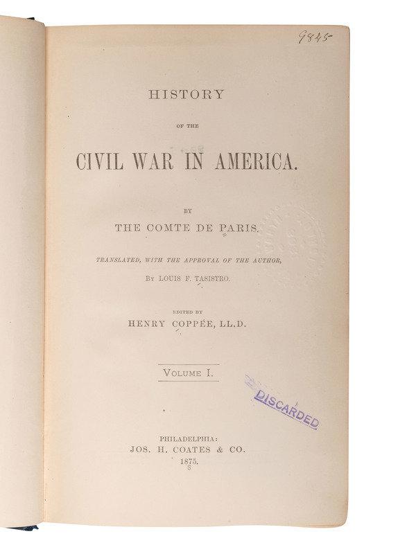 PARIS, Louis Philippe Albert d'Orleans, Comte de (1838-1894). TASISTRO, Louis F., translator. COPPÉE, Henry, editor. History of the Civil War in America. Philadelphia: Jos. H. Coates & Co. (Vol. I), Porter & Coates (Vol. II-IV), 1875-1888.