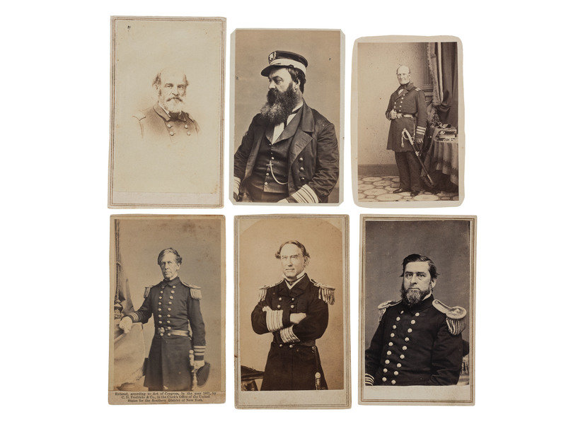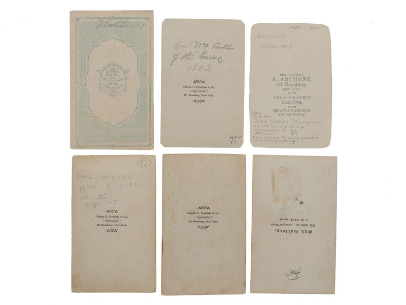 Half-length profile portrait of Commodore William D. Porter. New York: Charles D. Fredricks, n.d. Imprint to verso. Pencil identified as "commander of the Essex, 1864." -- Three-quarter standing portrait of Rear Admiral Charles Wilkes. New York: C.D. Fredricks & Co., 1861. Imprint to verso, copyright statement to recto. -- Full-length standing portrait of Rear Admiral Silas H. Stirlingham (retired list July 1862). New York: E. Anthony, after Brady, n.d. Imprint to verso. -- Three-quarter portrait of Admiral David G. Farragut in dress uniform with epaulettes with his arms crossed. New York: Charles D. Fredricks & Co., [July 1866]. Imprint to verso. -- Half-length seated portrait of Rear Admiral Andrew Foot (d. July 1862). Memphis, TN: Oak Gallery, J.W. Taft, n.d. -- Vignetted engraving of an unknown officer. New York: C.D. Fredericks, n.d. Pencil inscription incorrectly identifies the subject as (George N.) "Hollins." -- Together, 6 albumen CDVs on cardstock mounts, condition generally very good, Porter carte trimmed with clipped corners, else good, Stringham CDV irregularly trimmed all around, else good.