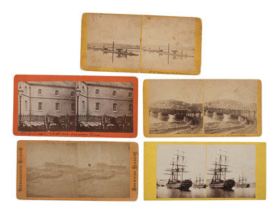 [CIVIL WAR]. A group of 5 stereoviews illustrating nautical and ordnance scenes, comprising: