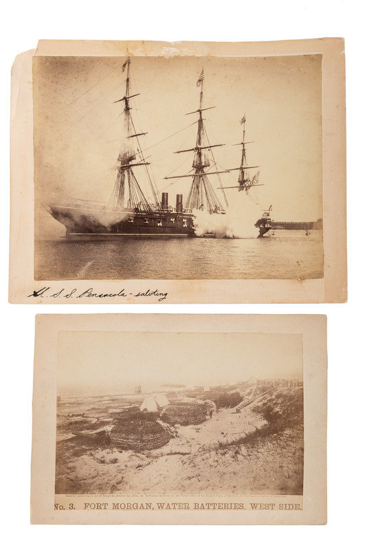 MCPHERSON & OLIVER, photographers. No. 3 Fort Morgan, Water Batteries, West Side. Louisiana, 1864. 7 3/4 x 5 1/2 in. albumen print on 9 1/4 x 6 1/2 in. cardstock mount (fading, some soiling to image and mount, edge and corner wear to mount). A photograph showing the aftermath of the Federal forces' successful siege on the crucial CSA-held fort guarding the entrance to Mobile Bay. Admiral Farragut's fleet had neutralized the Confederate naval forces and complementary batteries in the Battle of Mobile Bay on August 5th, allowing General Gordon Granger's forces to commence a complementary land-based siege on the fort. The rebels held out for over two weeks before surrendering on 23 August 1864, after sabotaging their guns.