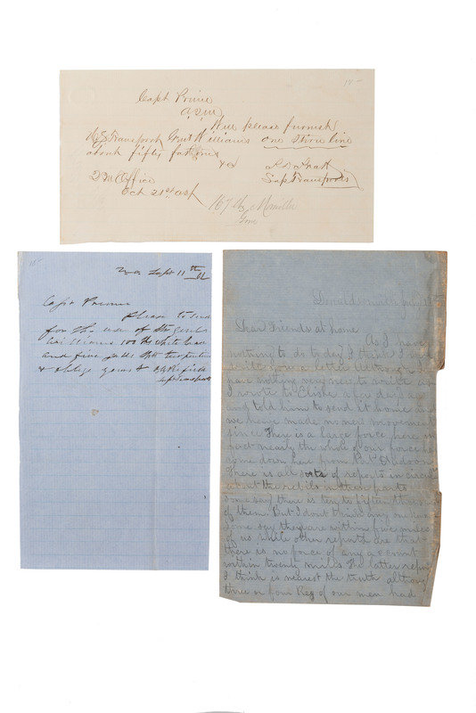 AN, N.O. Sept 11th ’62 “Capt Prince(?) / Please to send for the use of the Genl Williams 100 lbs white ??? and five gals. ??? turpentine & oblige yours, A.A. Pie?? / Supt Transport.” Second note, Q.M. Office, Oct. 21st, ‘62: “Capt. Prince / AQM / Will please furnish U.S. Transport Genl Williams one throw(?) line about fifty fathoms &c. / R.D. Pratt / Supt. Transports.”