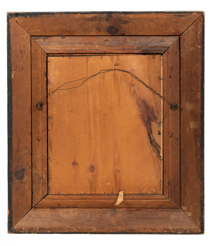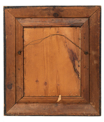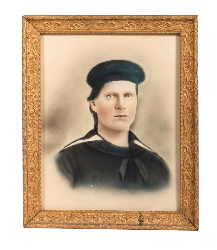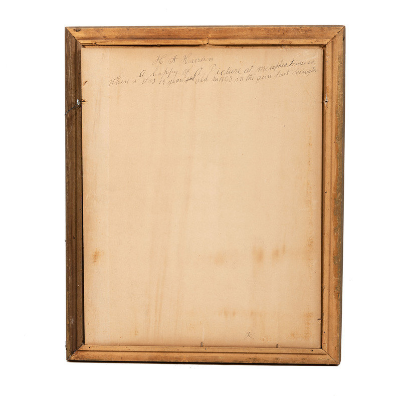 15 7/8 x 20 in. portrait on board of young man identified as "H.A. Harrison" (minor abrasions, loss to color near center bottom left, wear especially along edge lines). Verso with inscription "A copy of a Picture at Memphis tennasee / When i was 19 years old in 1863 on the gun boat Covington." Originally housed in gold frame but frame backing and glass missing.